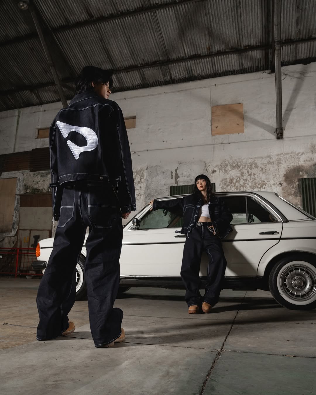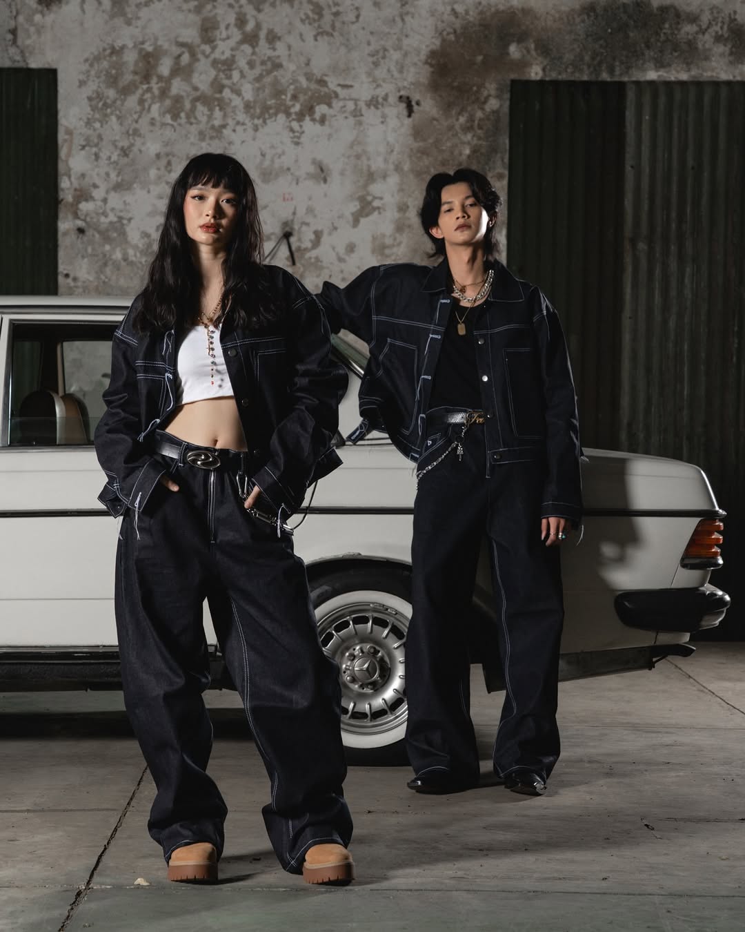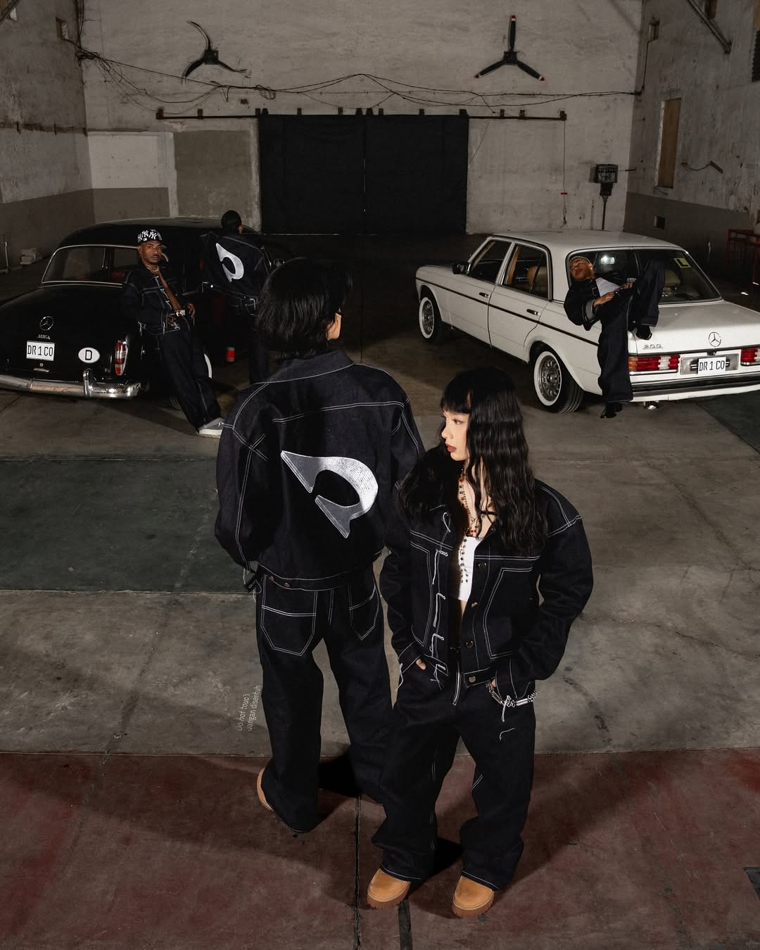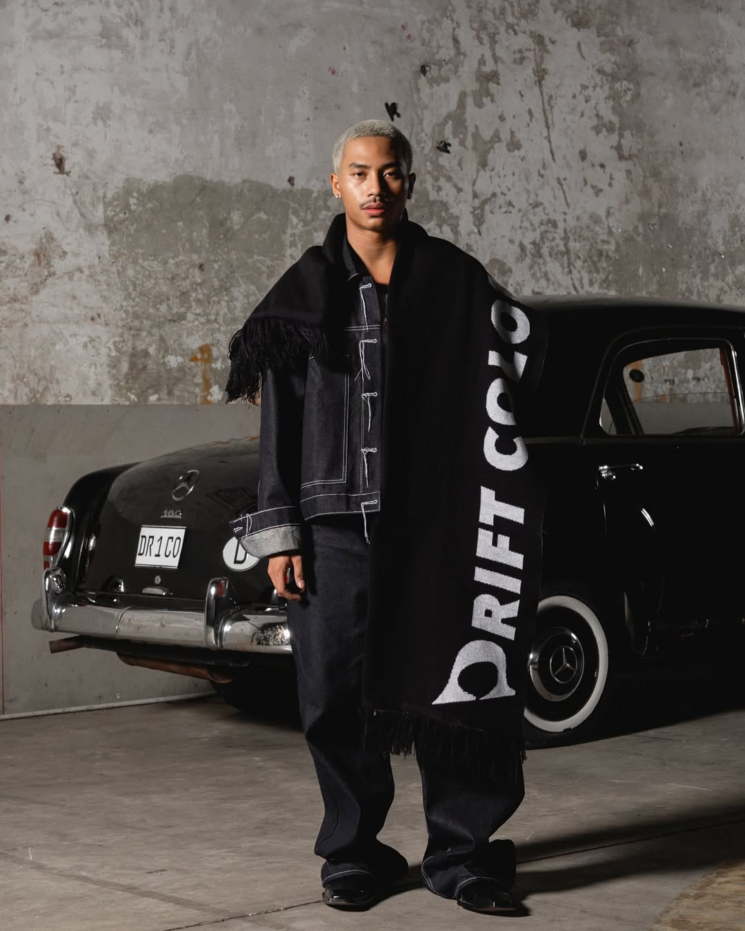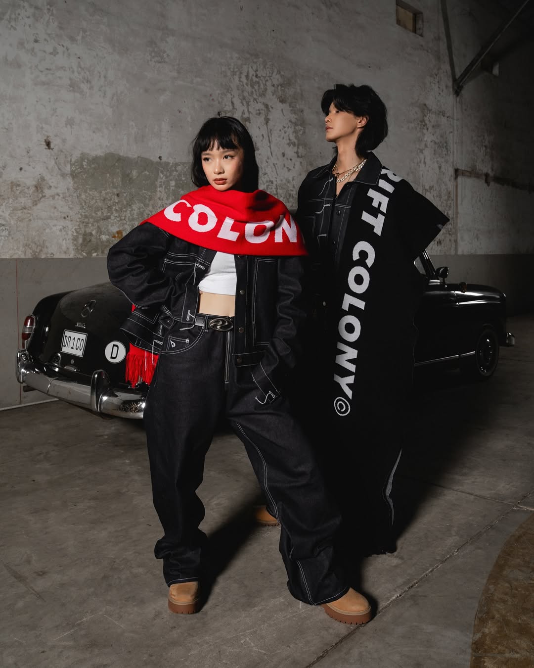 The models stand bold against a textured concrete wall and vintage car backdrop — a juxtaposition of heritage and rebellion. Draped in oversized silhouettes and striking scarves emblazoned with the brand name, the scene radiates confidence and unity, a visual that mirrors Drift Colony’s identity: loud, unapologetic, and rooted in movement.