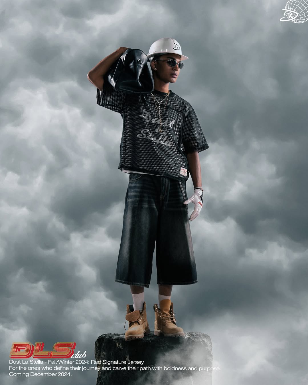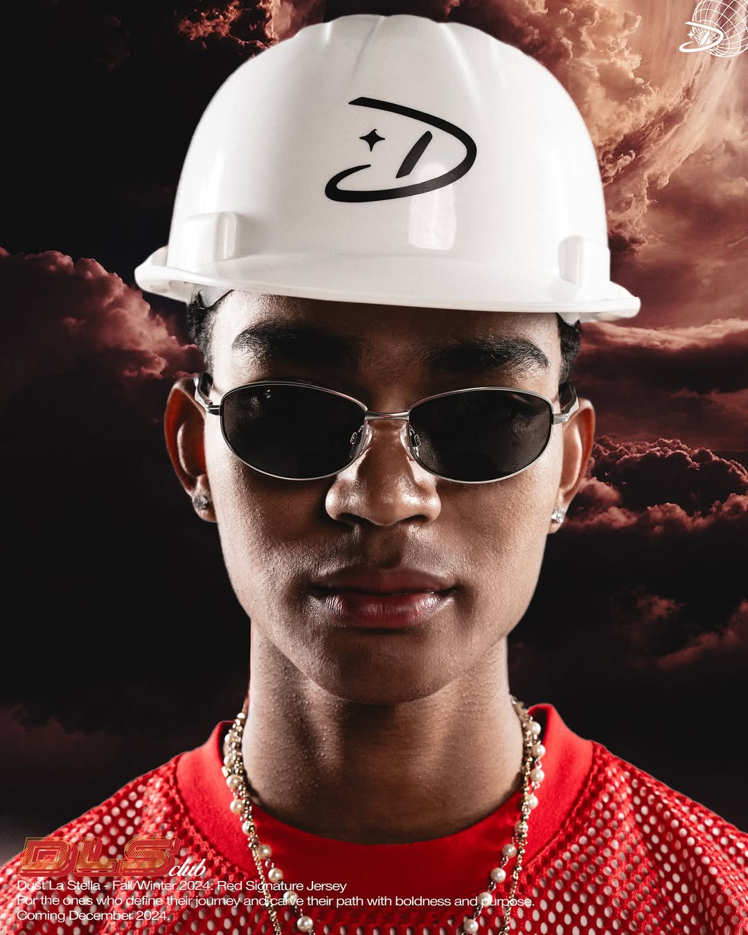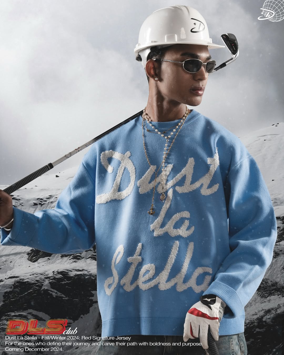 This campaign for Dust La Stella’s Fall/Winter 2024 collection highlights a striking fusion of futuristic edge and bold identity. The model, styled in sleek sunglasses, a pearl chain, and a vibrant red jersey, wears a branded white hard hat that symbolizes resilience and vision. Set against a dramatic sky backdrop, the visual embodies Dust La Stella’s ethos—fashion as a statement of strength, individuality, and forward momentum. With its tagline “For the ones who define their journey and carve their path with boldness and purpose,” the brand reinforces its role as a guide for those unafraid to stand out.