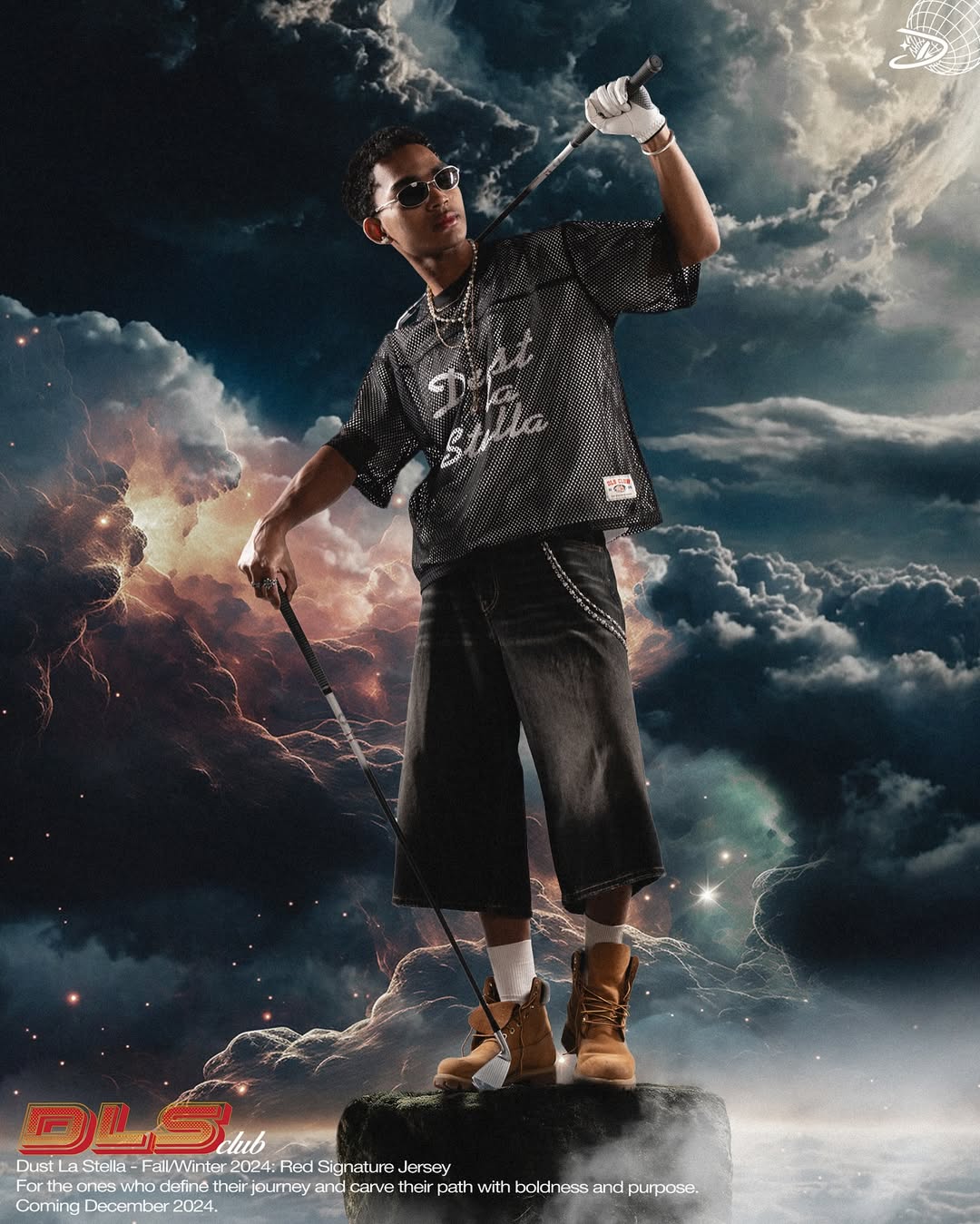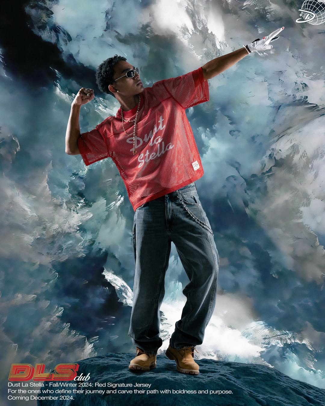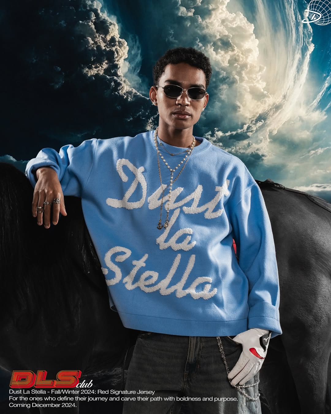 This campaign for Dust La Stella’s Fall/Winter 2024 collection highlights a striking fusion of futuristic edge and bold identity. The model, styled in sleek sunglasses, a pearl chain, and a vibrant red jersey, wears a branded white hard hat that symbolizes resilience and vision. Set against a dramatic sky backdrop, the visual embodies Dust La Stella’s ethos—fashion as a statement of strength, individuality, and forward momentum. With its tagline “For the ones who define their journey and carve their path with boldness and purpose,” the brand reinforces its role as a guide for those unafraid to stand out.