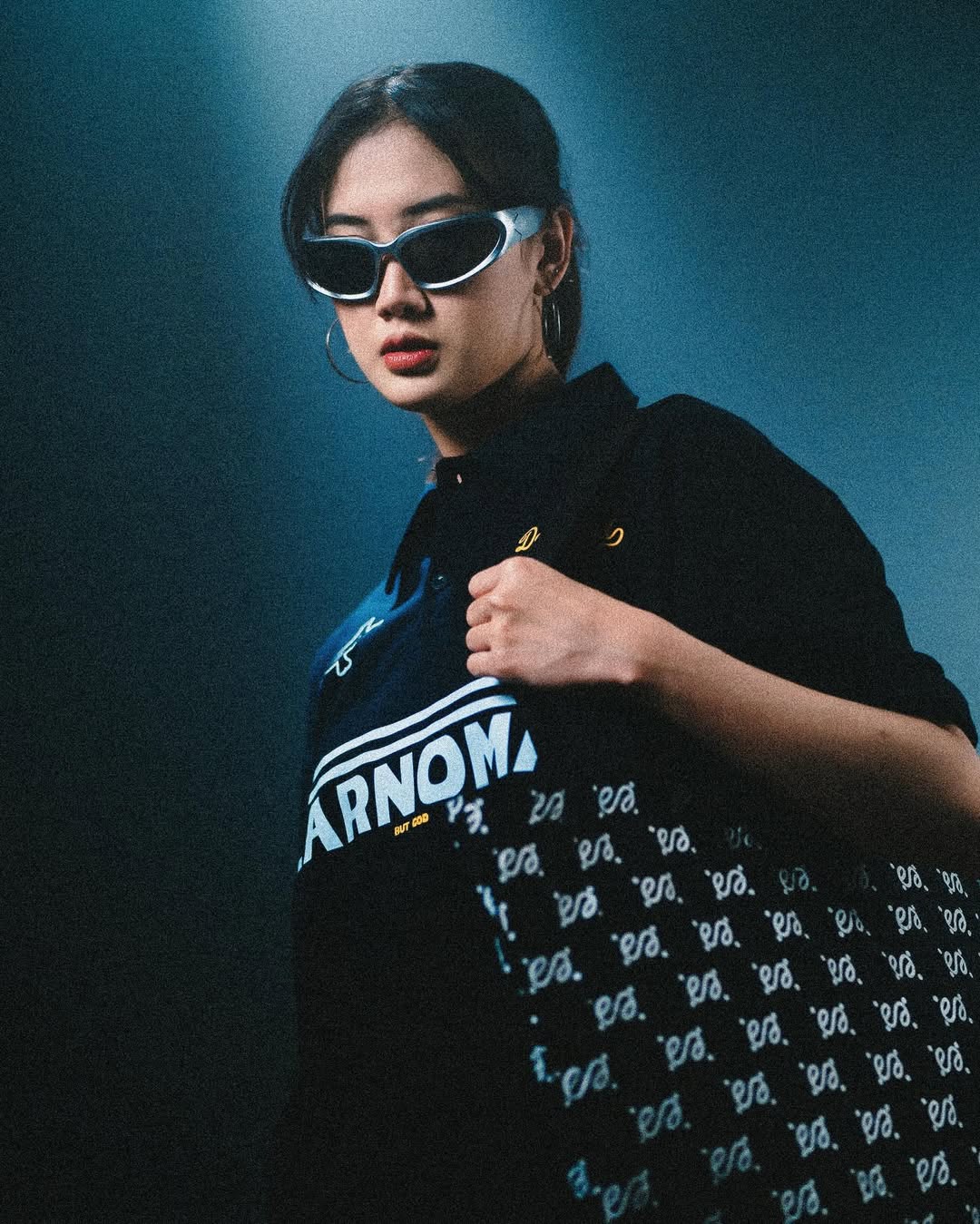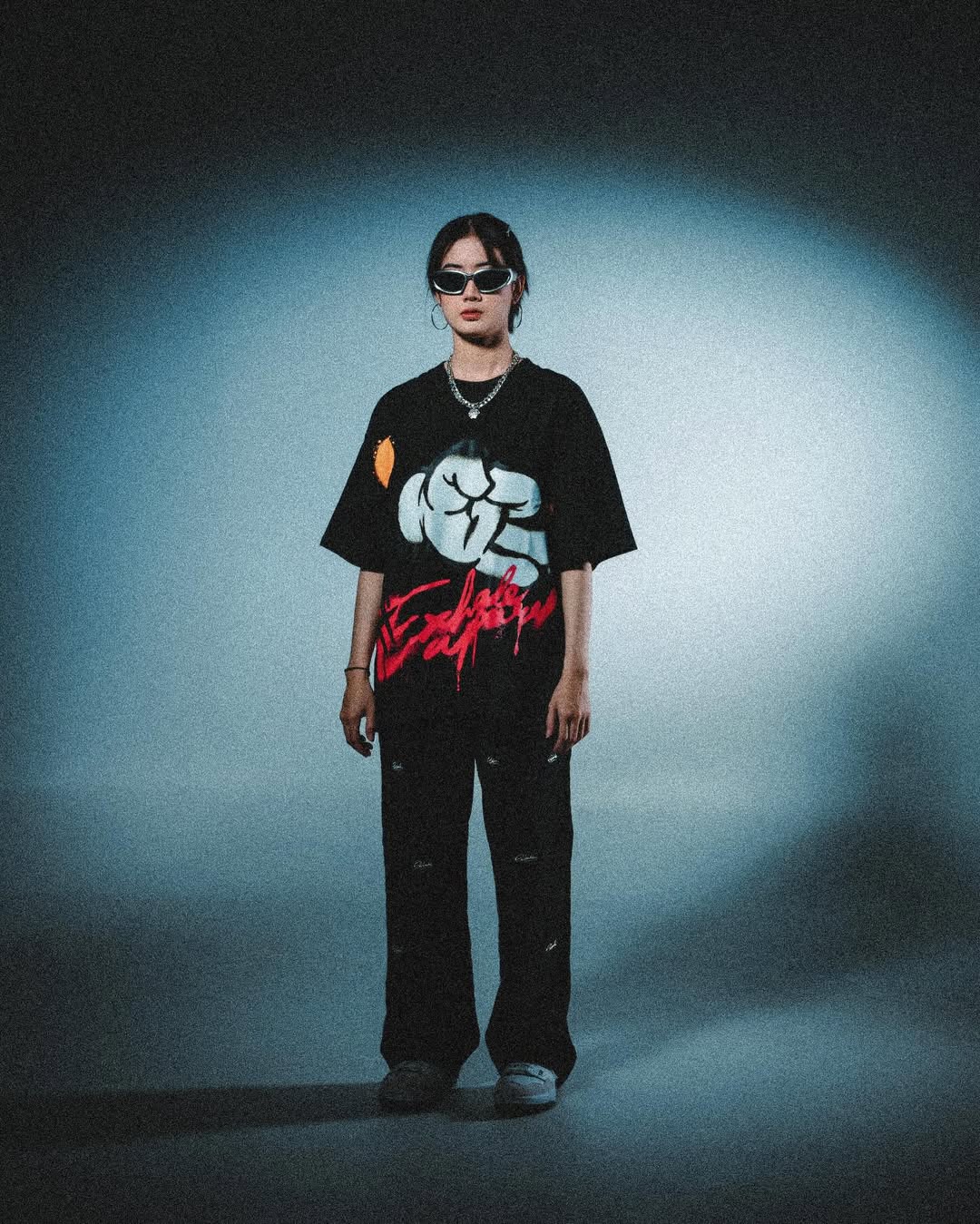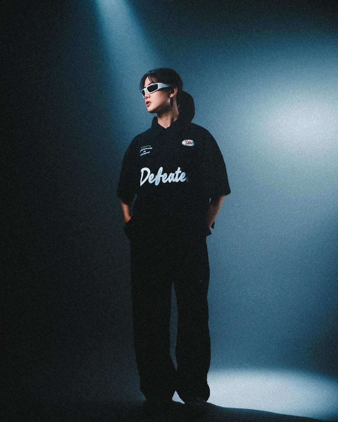 This striking visual for Exhale Apparel embraces a bold and futuristic aesthetic, with the model standing under a dramatic spotlight that cuts through the moody backdrop. Dressed in an all-black outfit featuring the brand’s “Defeate” statement tee, paired with sleek wide-leg pants, the look is amplified by futuristic white sunglasses that exude confidence and edge. The minimalist yet powerful composition highlights Exhale’s vision of streetwear as a form of self-expression—clean, daring, and unapologetically modern.