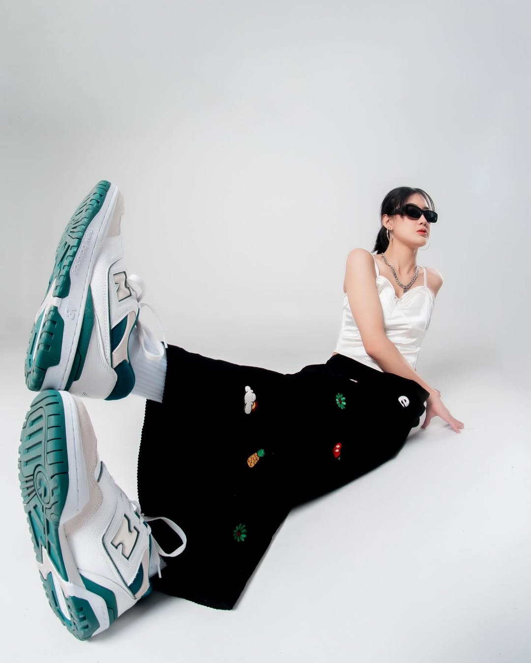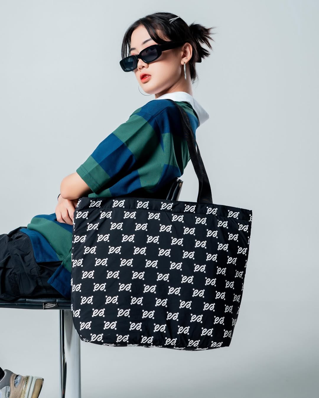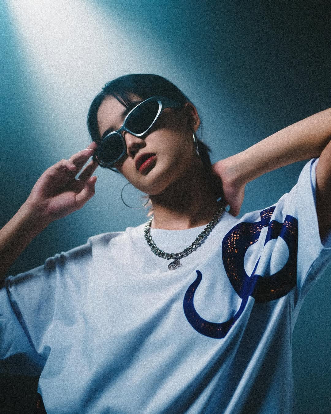 This striking visual for Exhale Apparel embraces a bold and futuristic aesthetic, with the model standing under a dramatic spotlight that cuts through the moody backdrop. Dressed in an all-black outfit featuring the brand’s “Defeate” statement tee, paired with sleek wide-leg pants, the look is amplified by futuristic white sunglasses that exude confidence and edge. The minimalist yet powerful composition highlights Exhale’s vision of streetwear as a form of self-expression—clean, daring, and unapologetically modern.