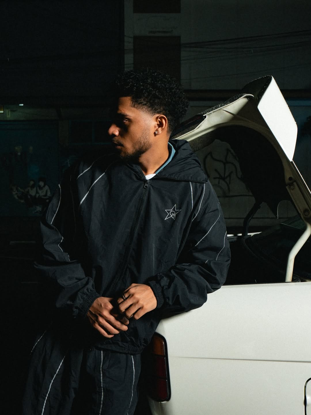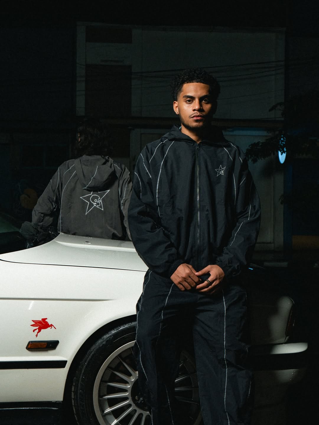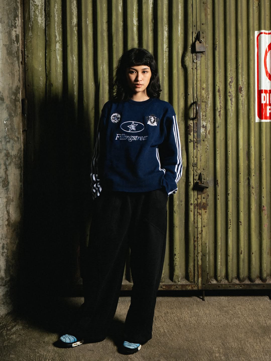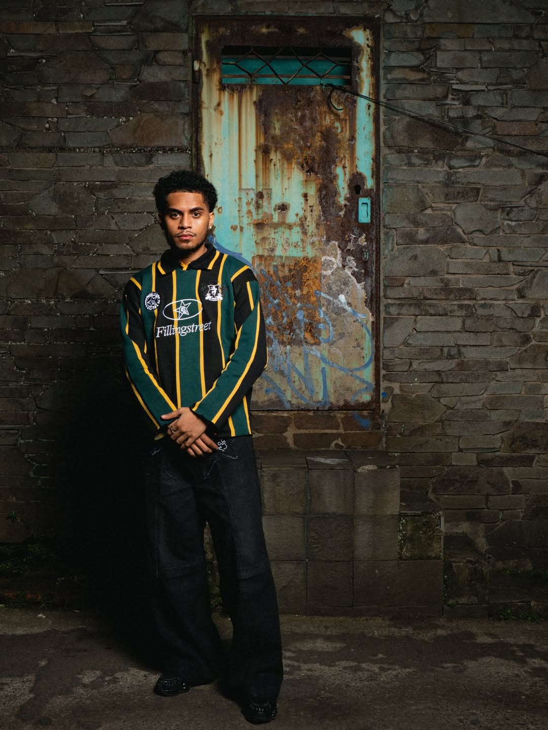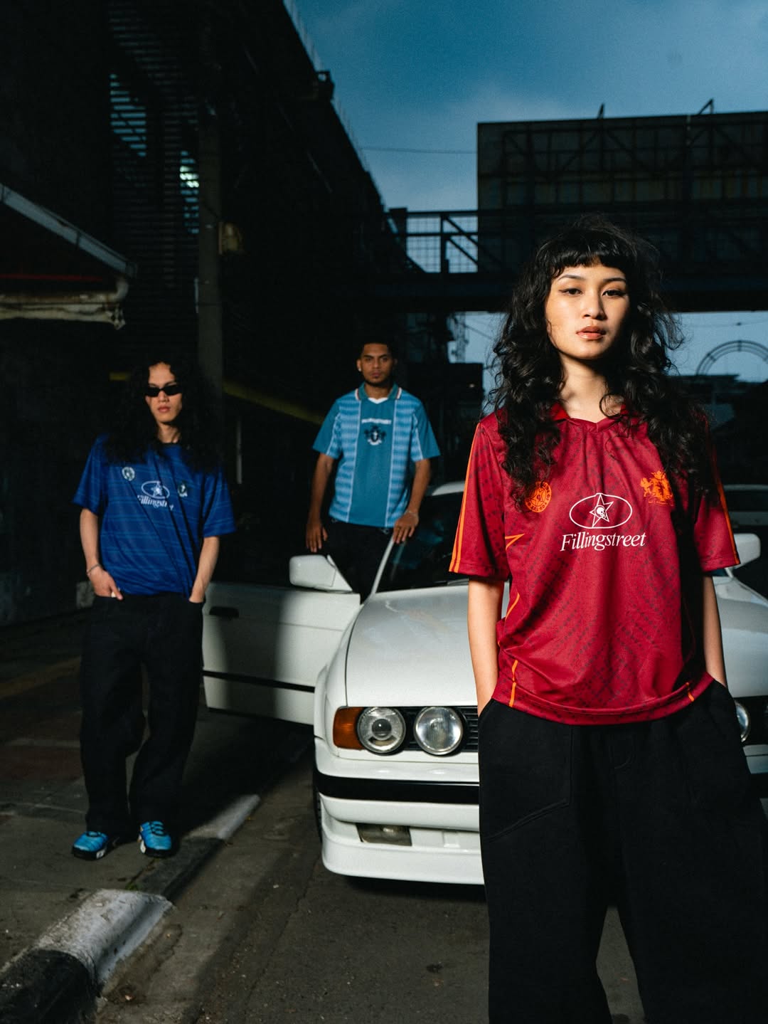 Set against a dimly lit street with a classic car as backdrop, the composition blends attitude, grit, and authenticity. The model’s stance is strong and unapologetic, framed in shadows that highlight contrast and intensity — reflecting Filling Street’s DNA: built on movement, rebellion, and presence.