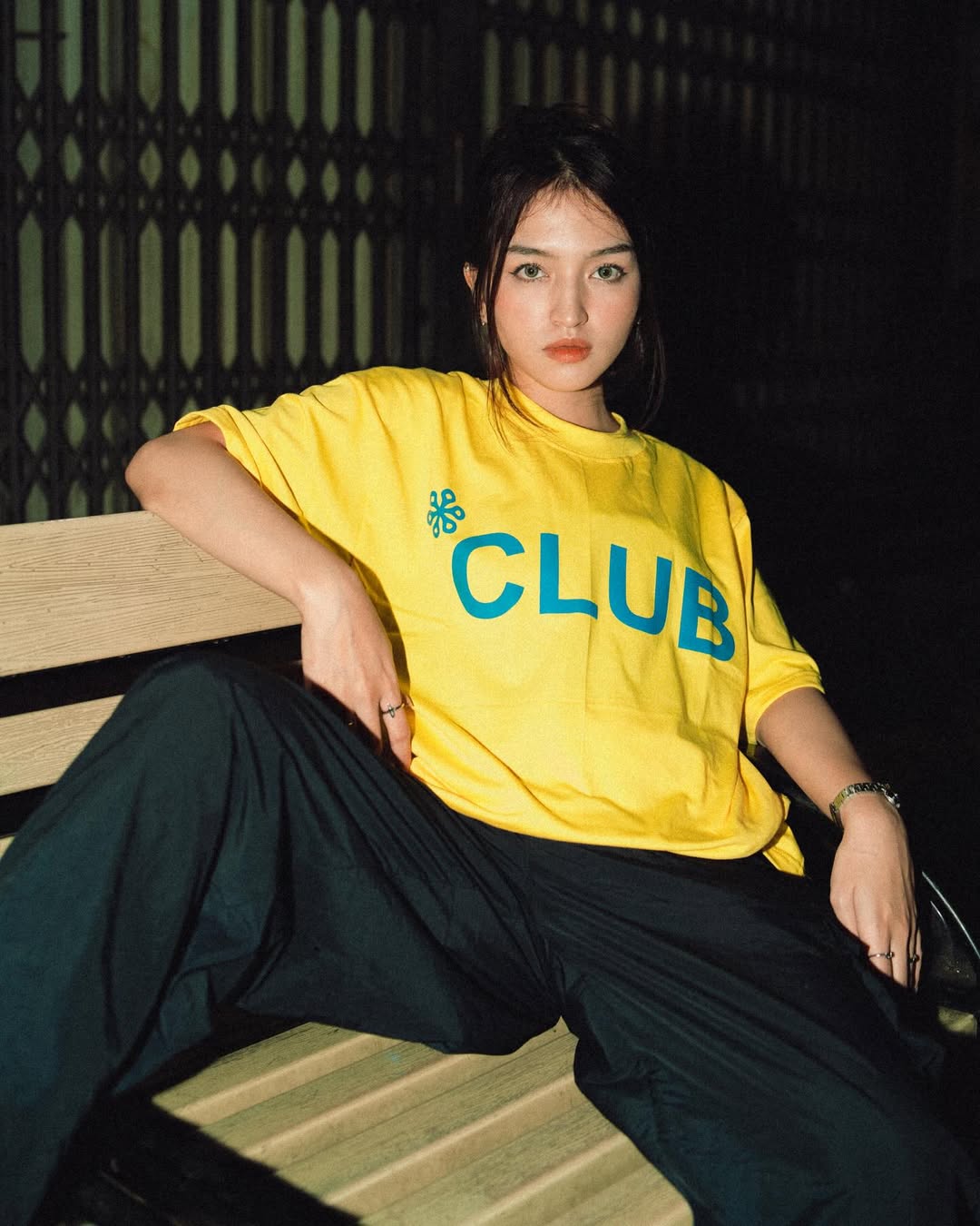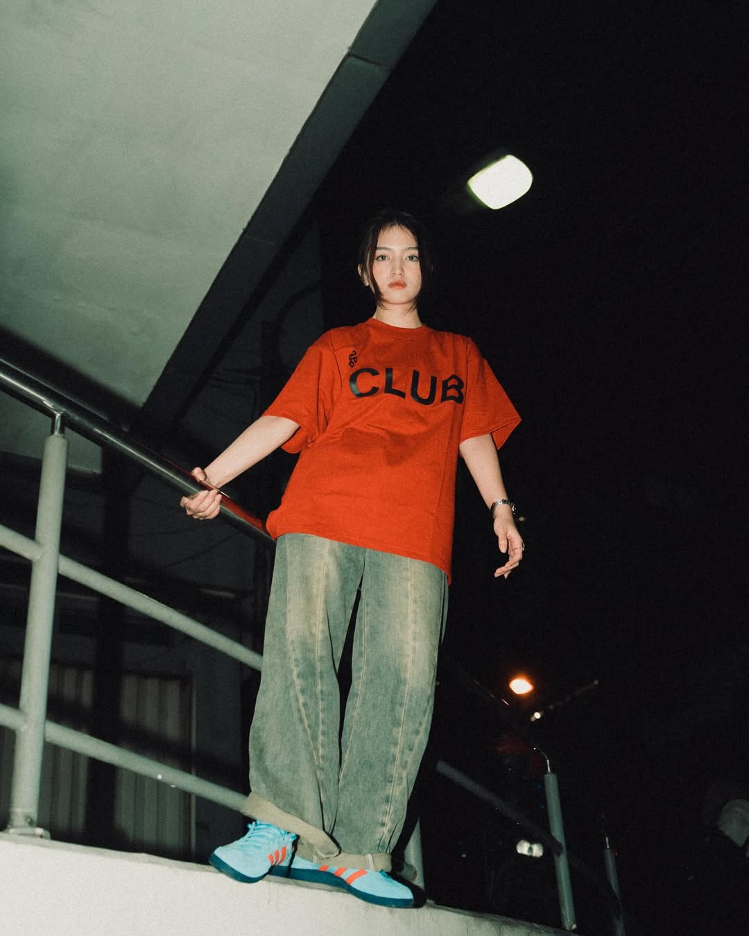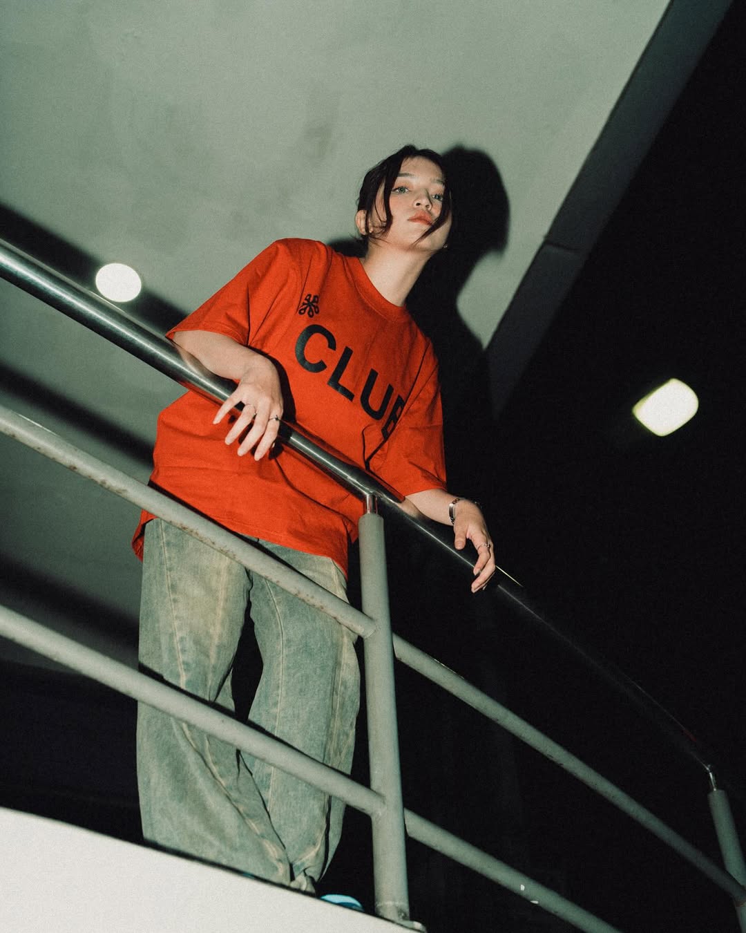 A model showcases a bold red oversized Lads of Club T-shirt styled with loose washed jeans. Captured from a low angle with strong lighting and deep shadows, the shot highlights a raw urban mood that feels confident and expressive. Produced by Caracteristica, this visual reflects the brand’s streetwear identity—modern, effortless, and unapologetically street.