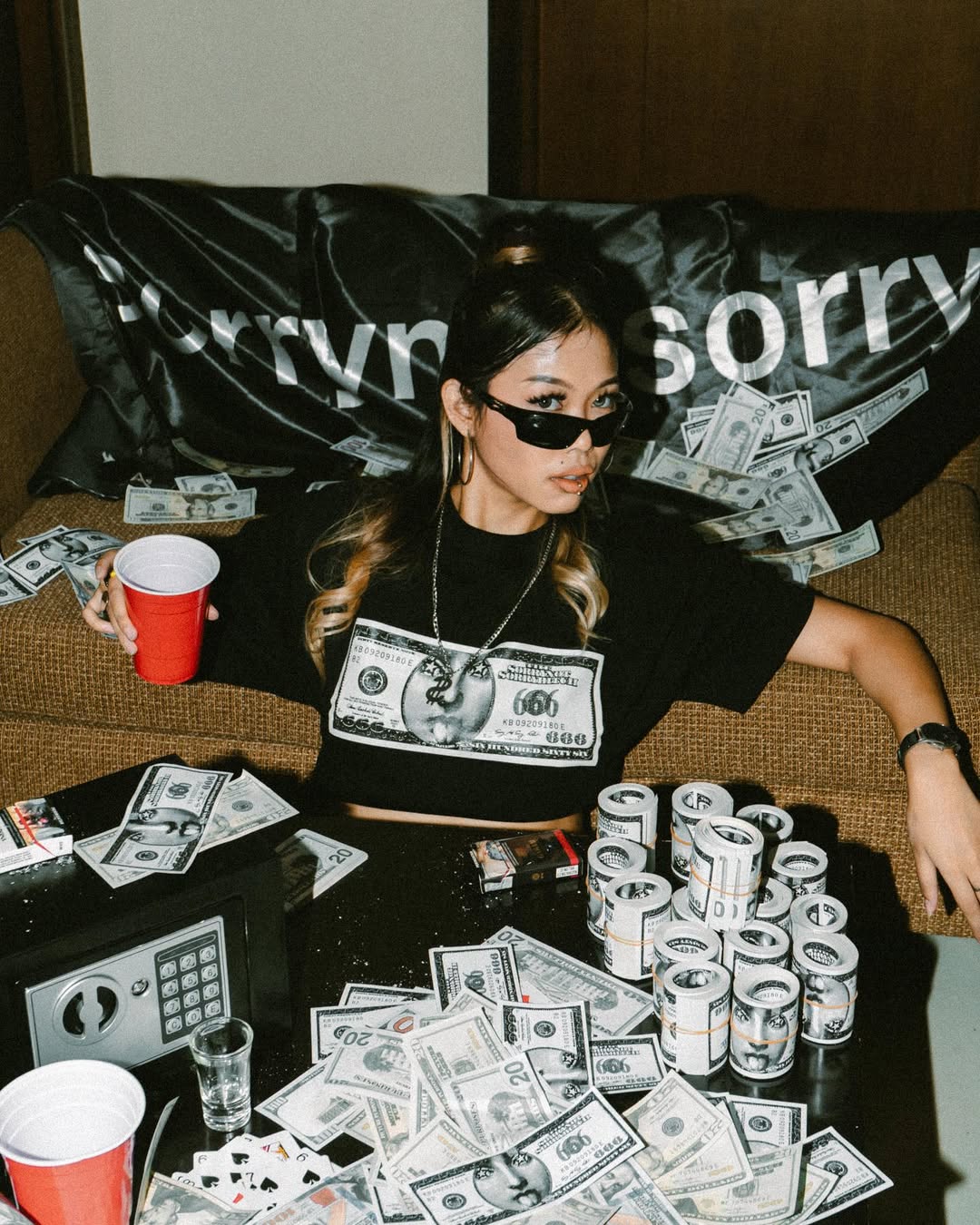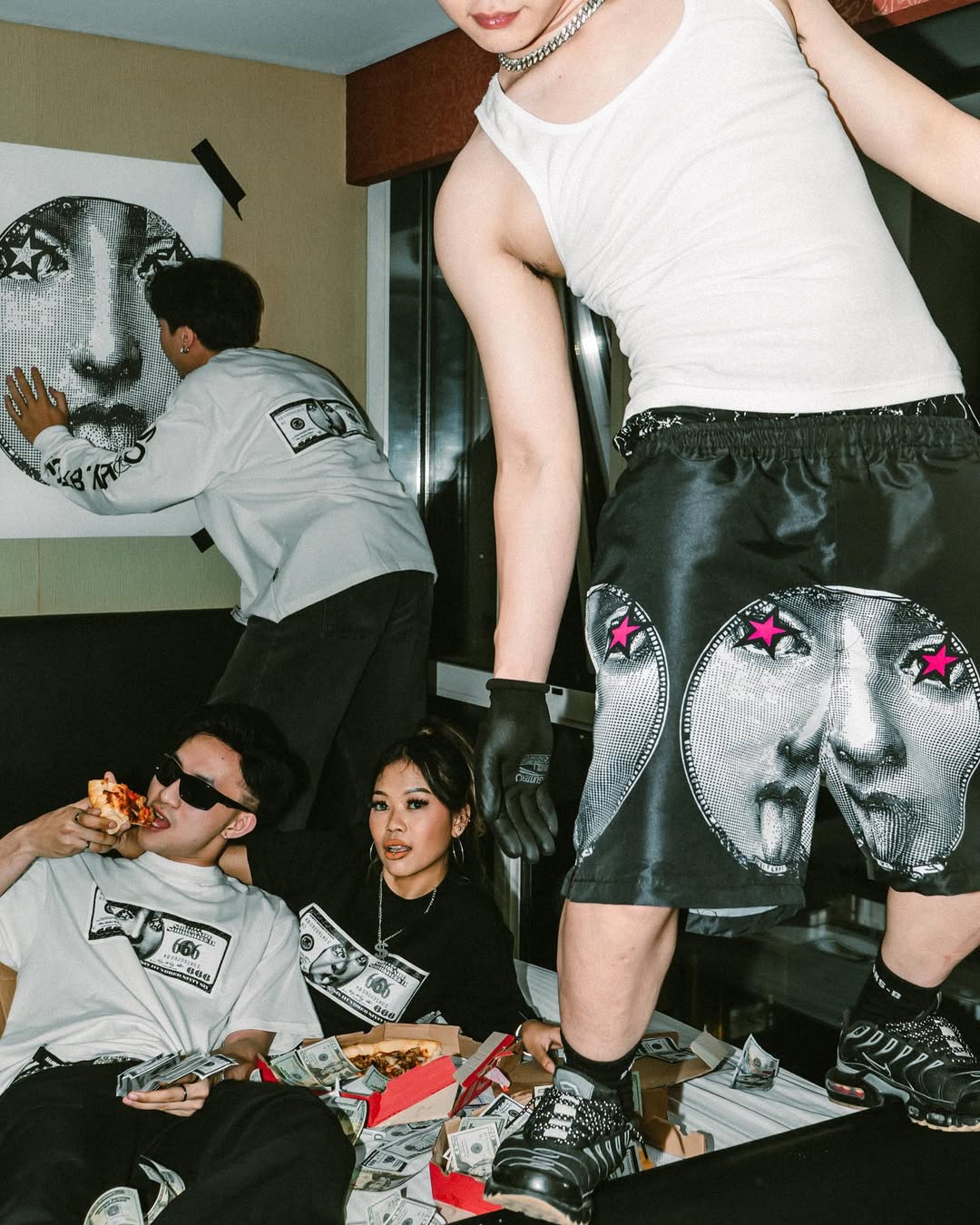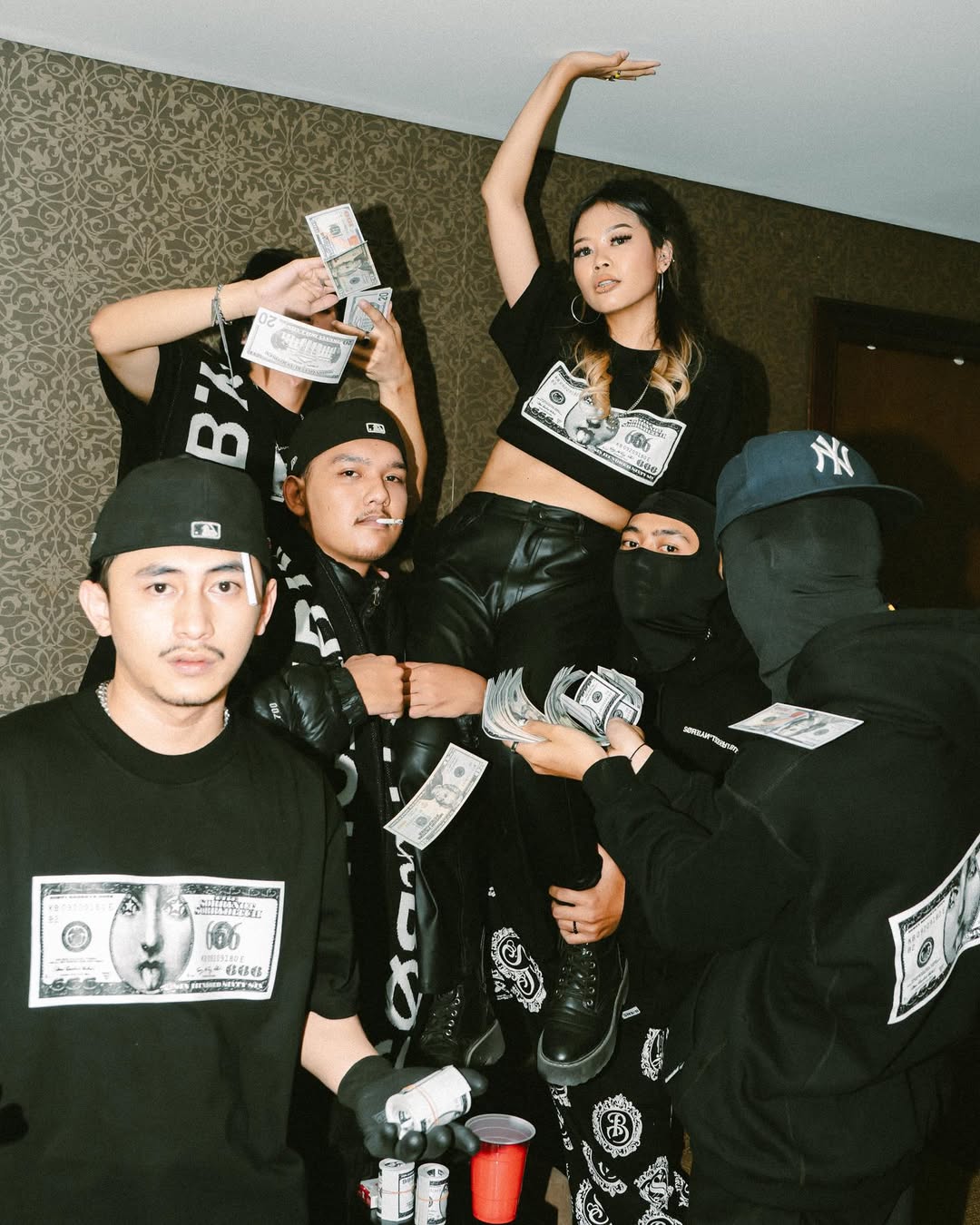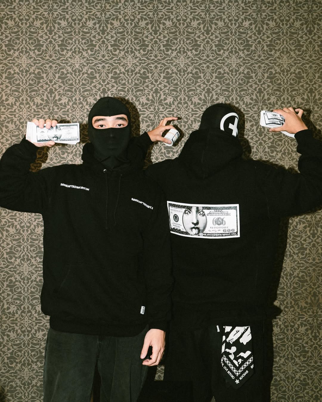 This bold campaign for SNSB channels underground street culture with a rebellious edge. Two models stand against a patterned backdrop, both dressed in all-black hoodies—one featuring the brand’s striking money-print graphic on the back—styled with masks and bandanas to amplify the outlaw aesthetic. Posing with stacks of printed bills, the scene exudes a raw, unapologetic attitude that defines SNSB’s identity: fearless, subversive, and rooted in the gritty energy of streetwear rebellion.