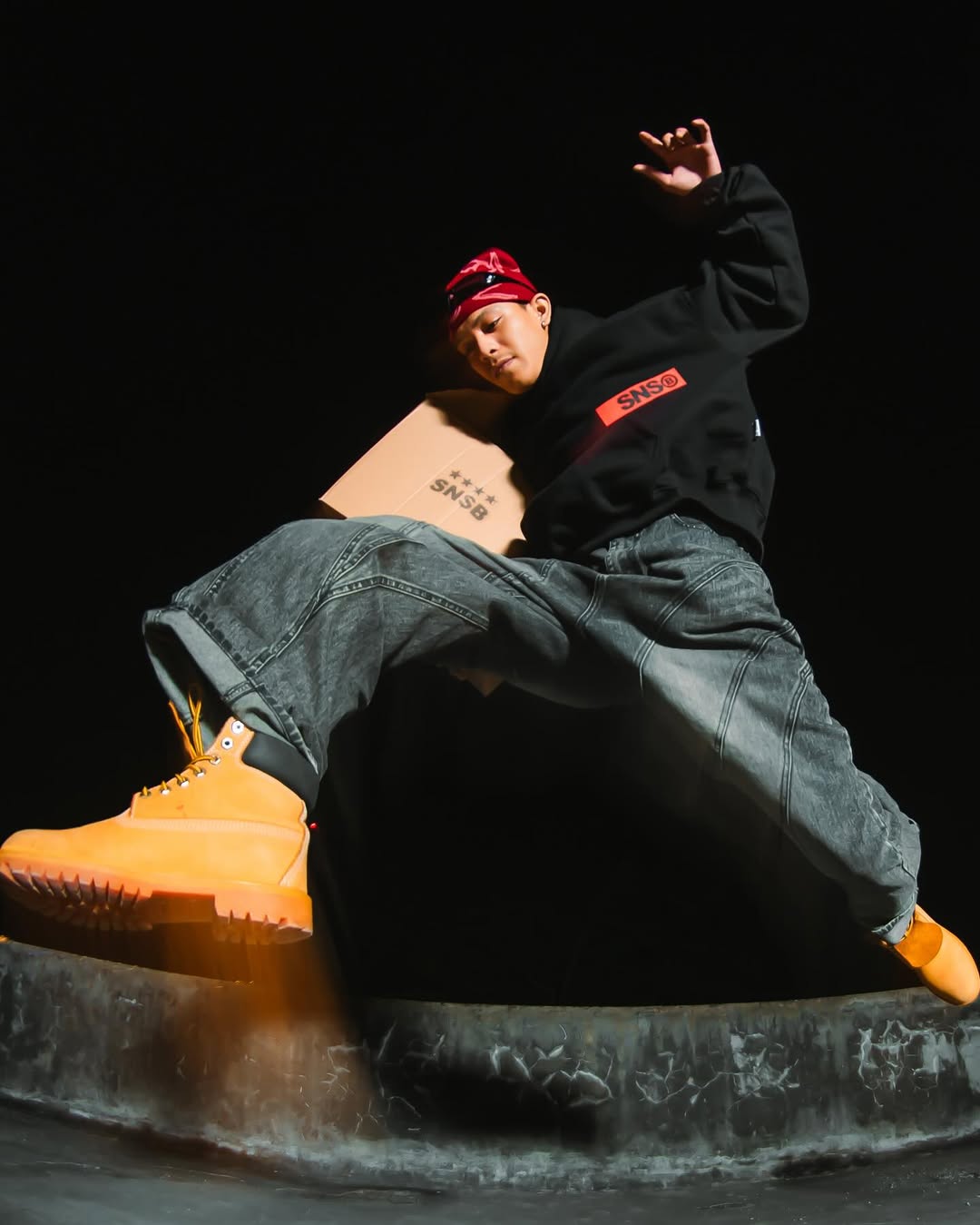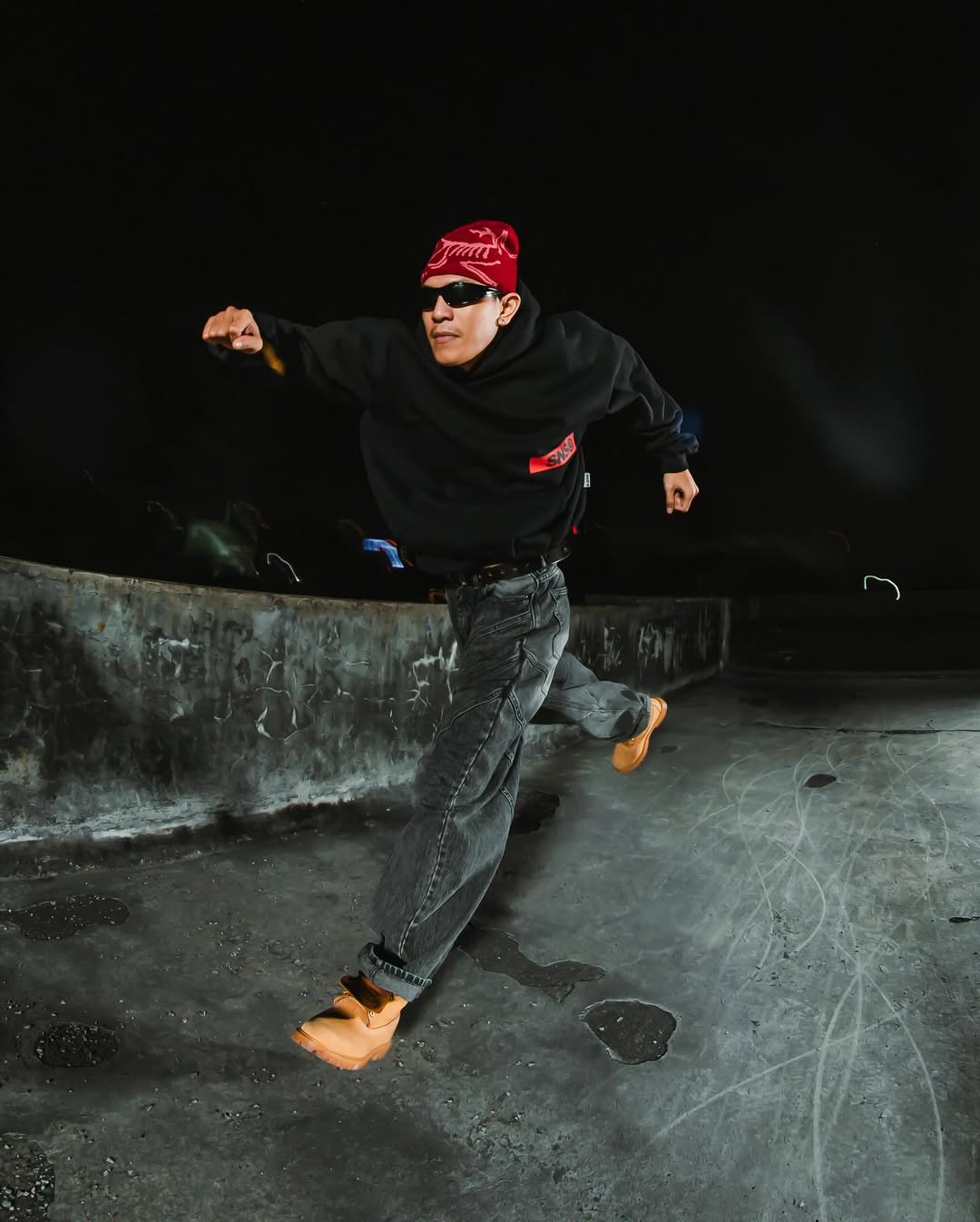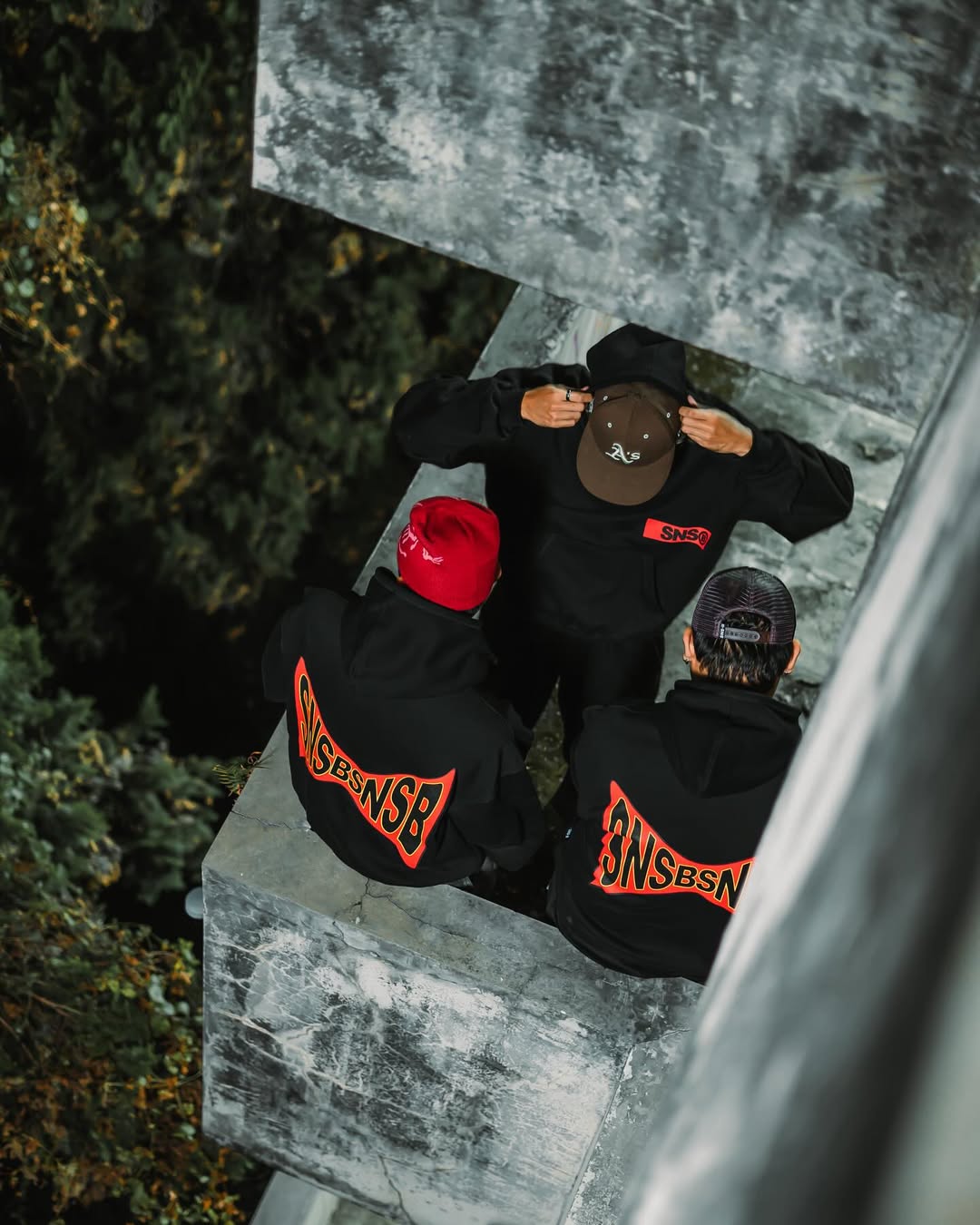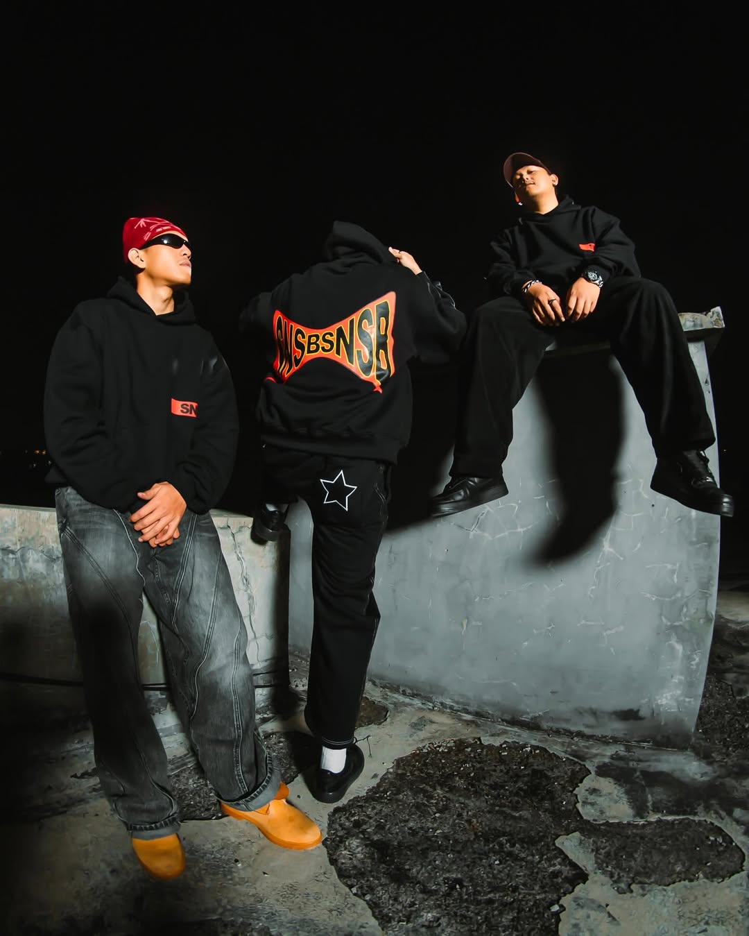 This photo captures three male models styled in bold, urban streetwear. They are dressed in oversized black hoodies featuring the graphic “SNSBNSR,” paired with baggy pants and standout accessories like a red bandana, sunglasses, and caps. Shot on a rooftop at night, the dramatic lighting and raw textures highlight an edgy, cinematic atmosphere.