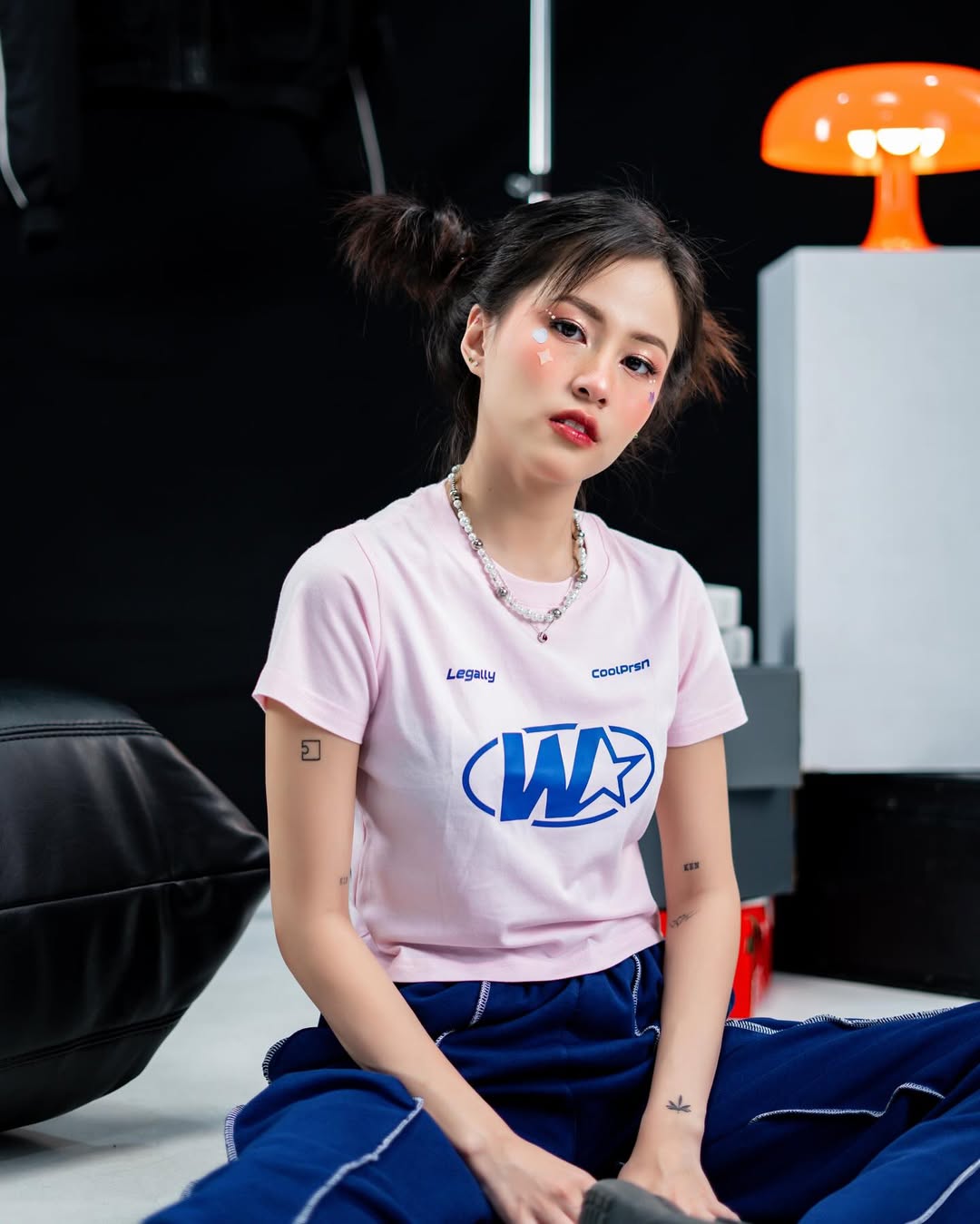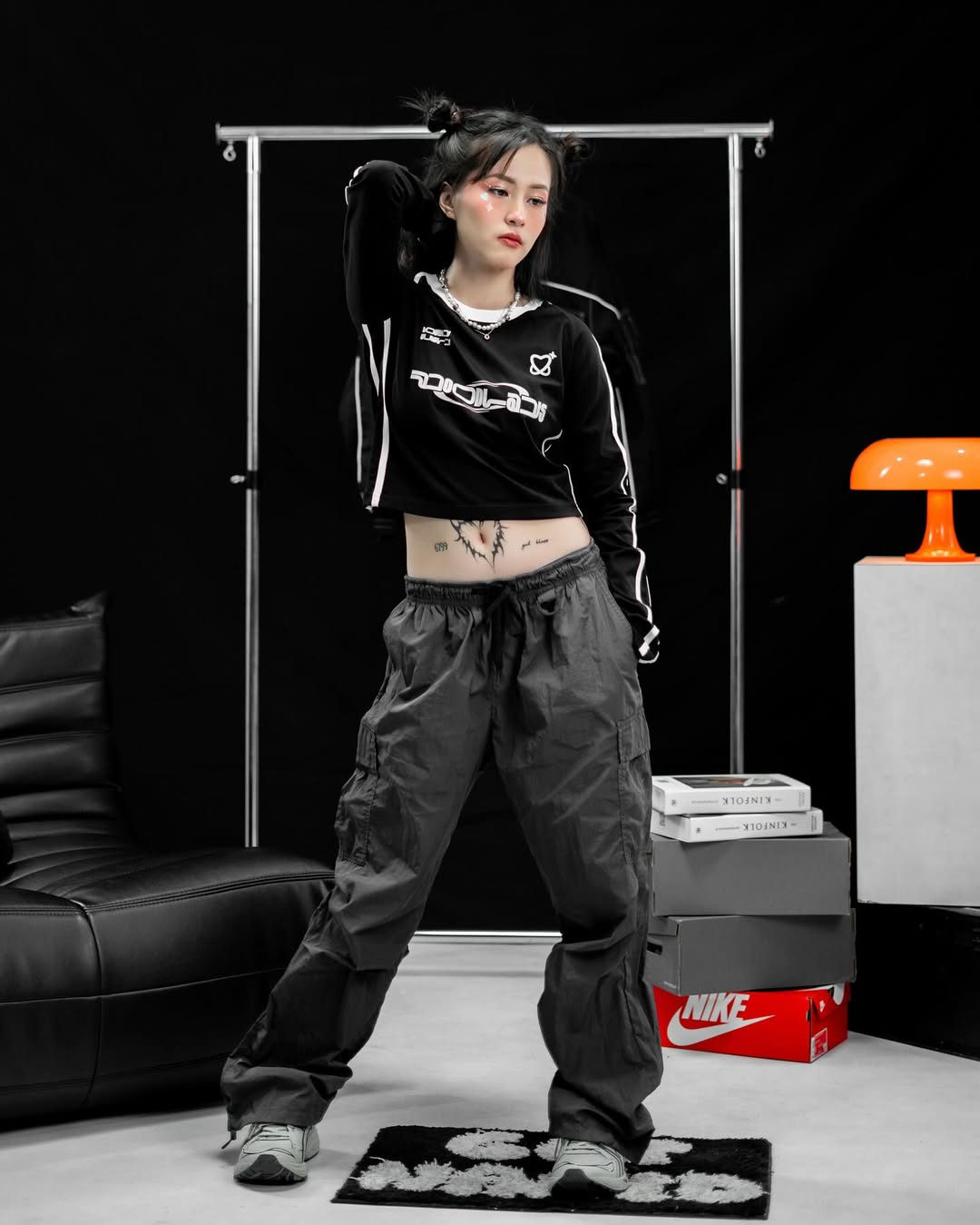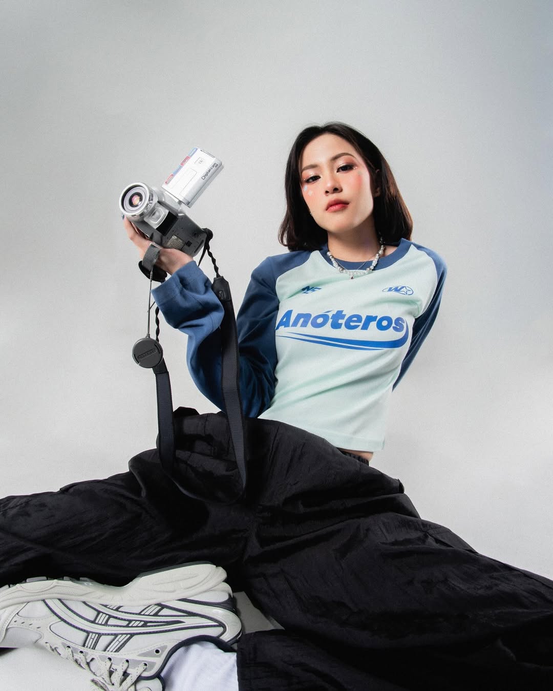 This editorial shot for Woodlays presents a fresh, modern streetwear vibe with a creative edge. The model, seated in a relaxed yet assertive pose, holds a vintage camcorder that adds a playful retro twist to the scene. She wears a sporty long-sleeve top in light blue with bold “Anoteros” branding, paired with loose black pants and chunky sneakers, embodying comfort and effortless style. The clean studio backdrop emphasizes her presence, allowing the outfit and accessories to stand out as symbols of individuality, youth culture, and self-expression.