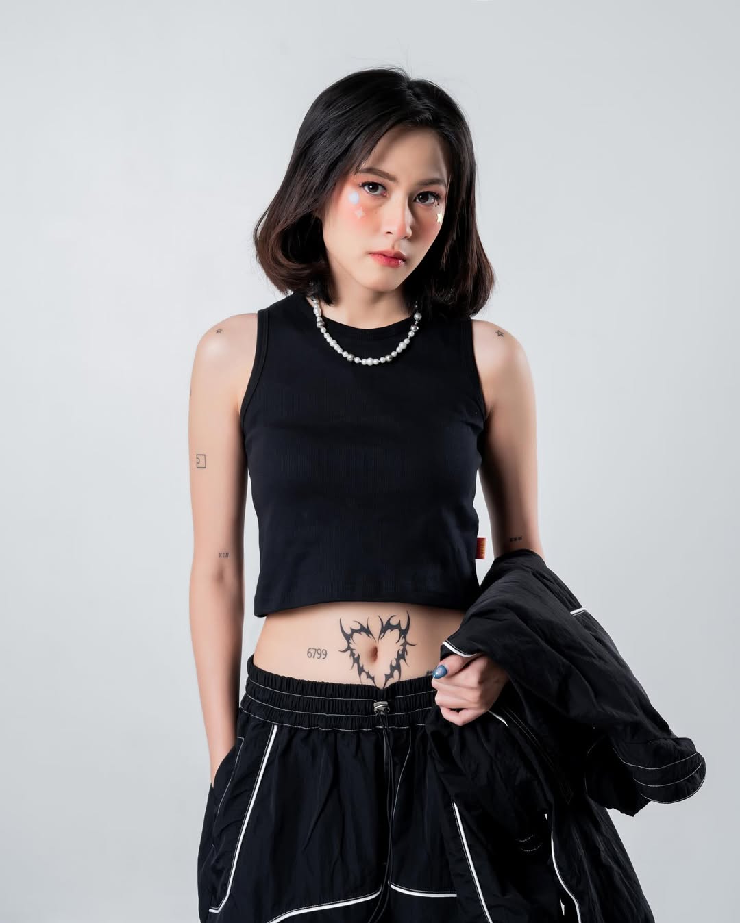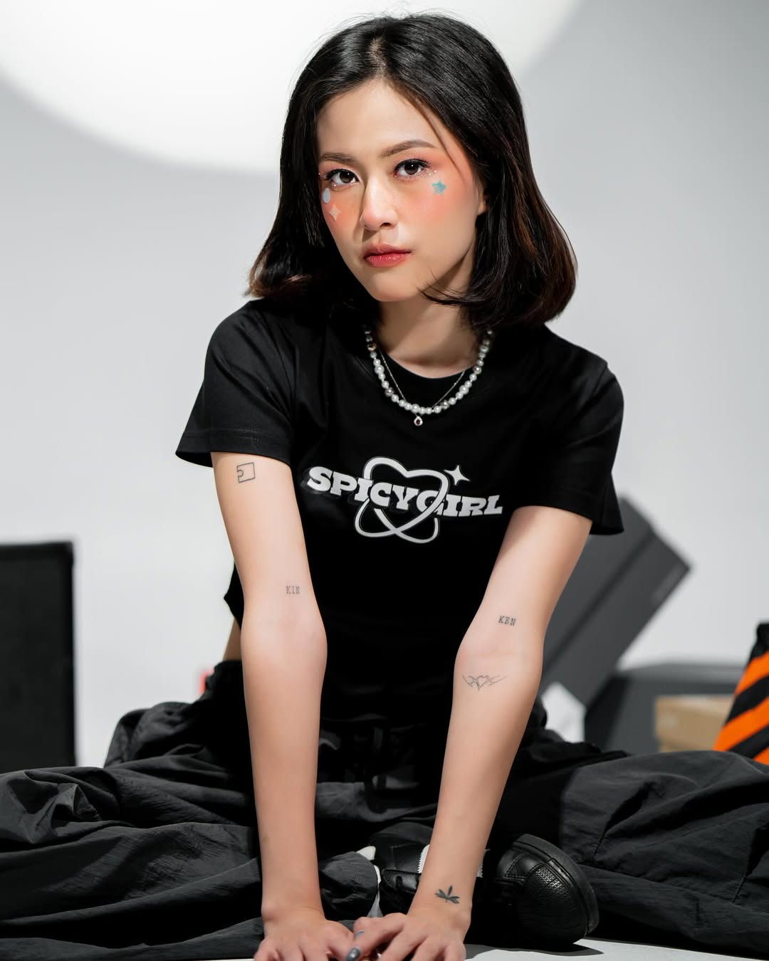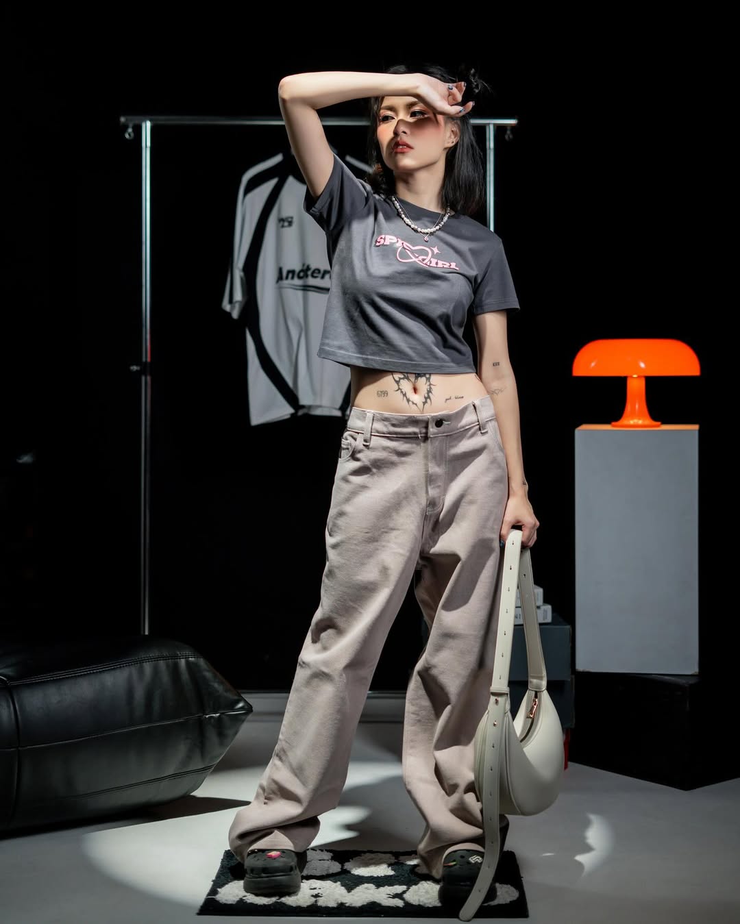 This editorial shot for Woodlays presents a fresh, modern streetwear vibe with a creative edge. The model, seated in a relaxed yet assertive pose, holds a vintage camcorder that adds a playful retro twist to the scene. She wears a sporty long-sleeve top in light blue with bold “Anoteros” branding, paired with loose black pants and chunky sneakers, embodying comfort and effortless style. The clean studio backdrop emphasizes her presence, allowing the outfit and accessories to stand out as symbols of individuality, youth culture, and self-expression.